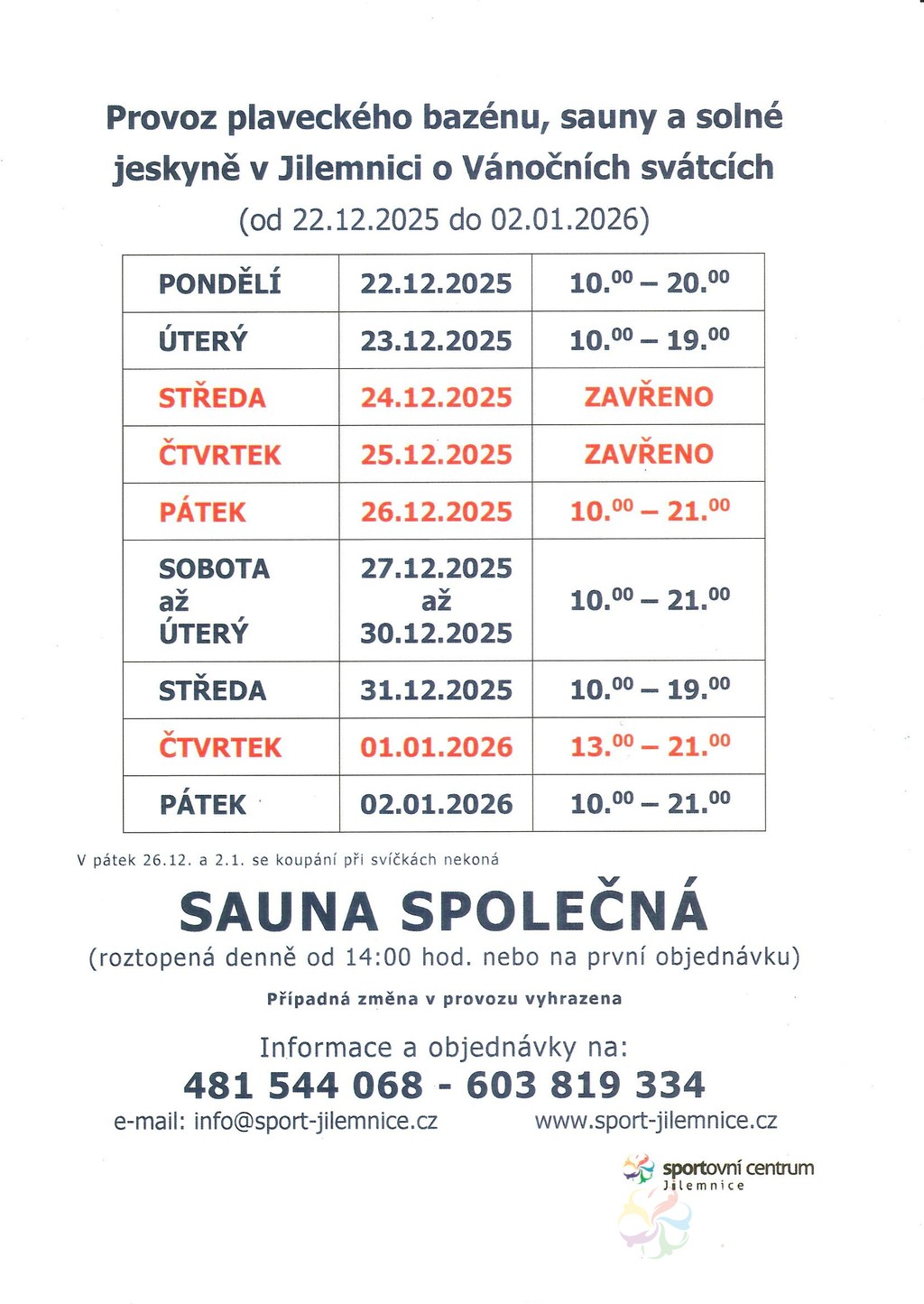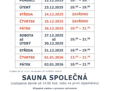 Vánoční provozní doba bazénu, sauny a solné jeskyně